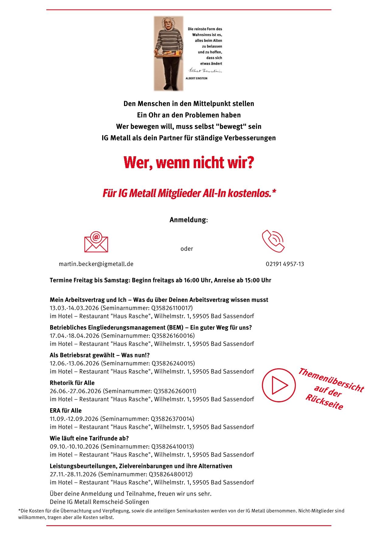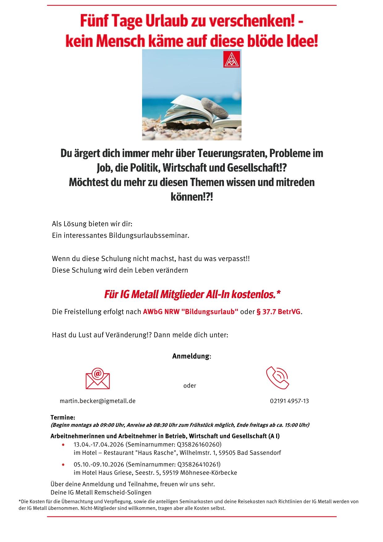 Hier findet Ihr die aktuellen Seminare die von Deiner IG Metall Geschäftsstelle Remscheid-Solingen angeboten werden. Hierbei handelt es sich um die Grundlagenseminare, die weiterführenden Seminare werden Zentral (Bundesweit) vom Vorstand angeboten, diese findet Ihr unter Zentrale Seminare.