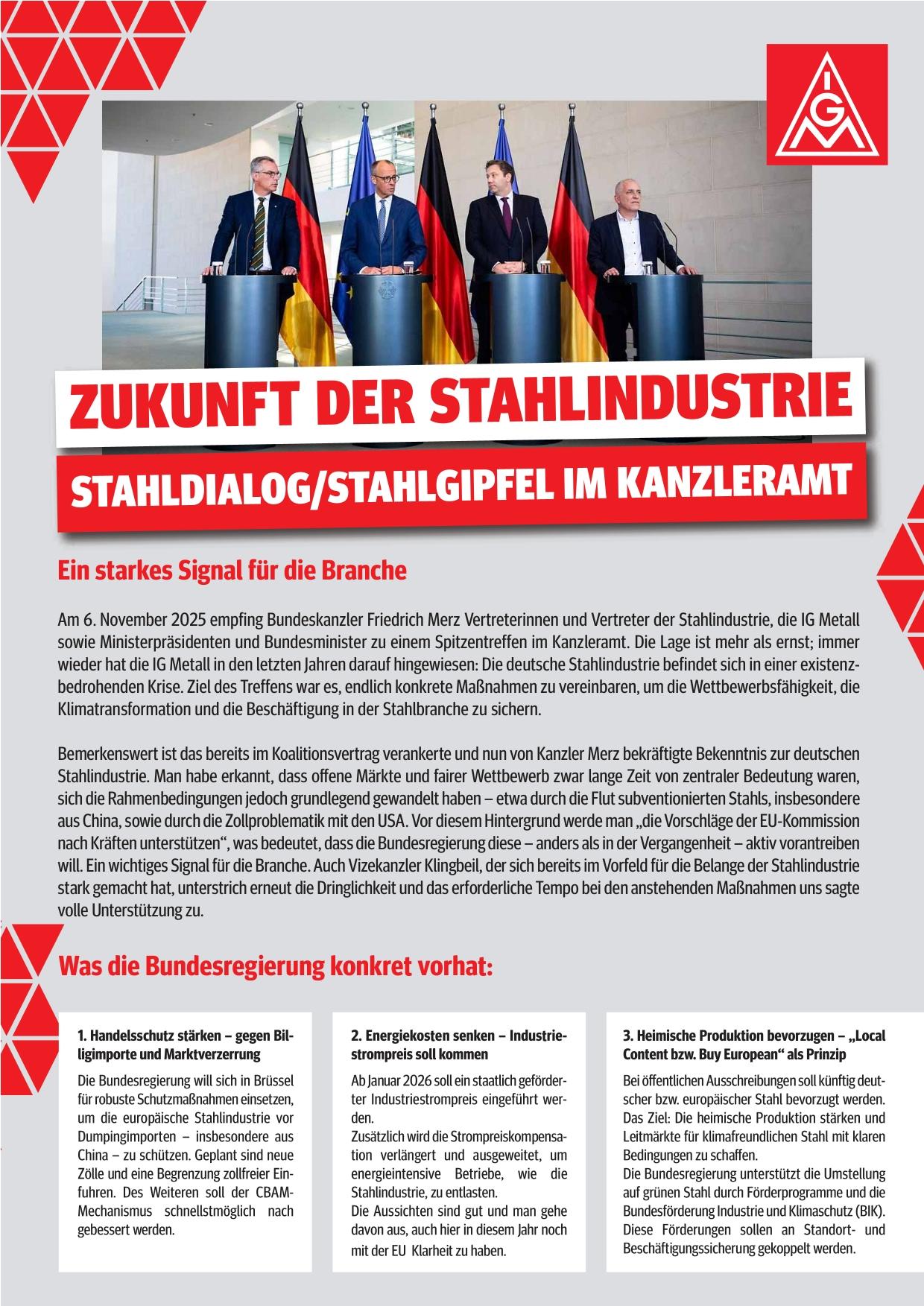 - Soziale Gestaltung der industriellen Transformation: Digitalisierung und Dekarbonisierung dürfen nicht zu Arbeitsplatzverlusten führen, sondern müssen mit Qualifizierung und Mitbestimmung einhergehen.